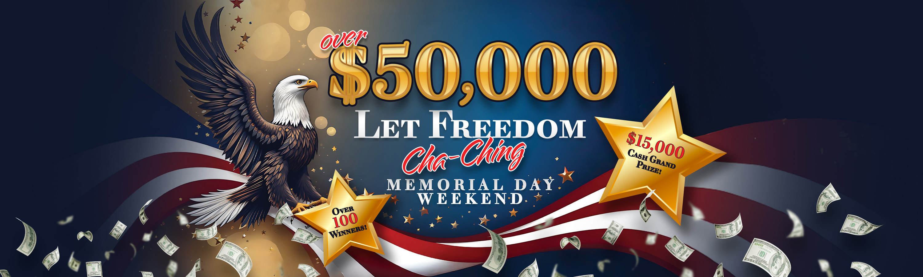 Over 100 winners take home a share of over $50,000 in Cash and Free Play during Peppermill's Let Freedom Cha-Ching Memorial Day Weekend, May 22 - 24, 2026. One lucky winner will take home a $15,000 Cash Grand Prize!